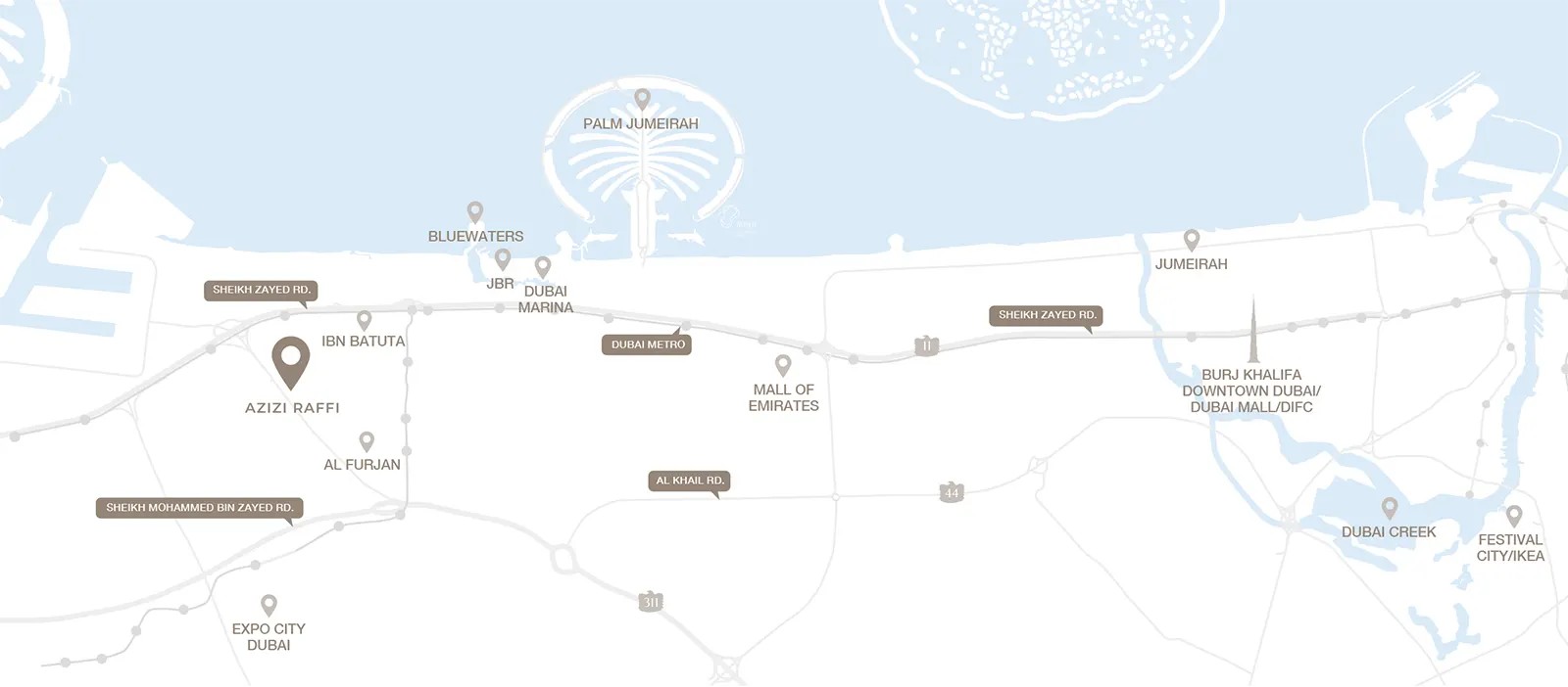 آپارتمانهای عزیزی رافی، یکی از پروژههای نوآورانه شرکت عزیزی، در منطقه الفرجان دبی واقع شدهاند و با طراحی معاصر و امکانات رفاهی متنوع، تجربهای جذاب از زندگی مدرن را ارائه میدهند. این پروژه در یکی از مناطق در حال رشد و پویای دبی قرار دارد و با نزدیکی به شبکه حملونقل عمومی، ایستگاه مترو، و مراکز تفریحی همچون دبی مارینا و ابنبطوطه مال، دسترسی فوقالعادهای به نقاط مختلف شهر فراهم میکند. عزیزی رافی برای کسانی که به دنبال تعادل میان زندگی شهری و آرامش حومه هستند، گزینهای مناسب است.